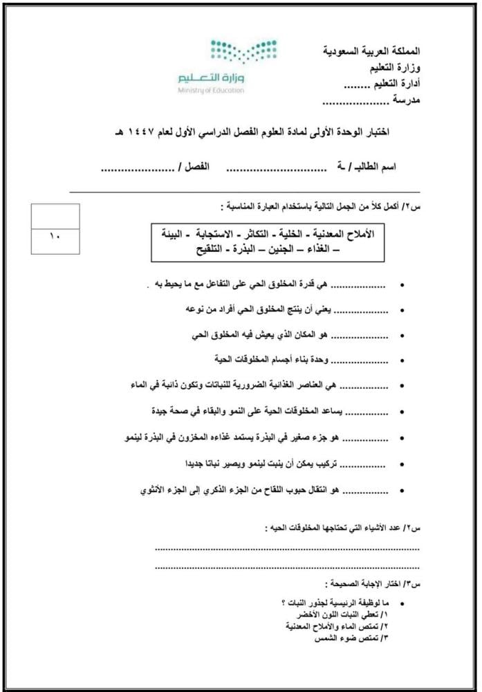 اختبار في العلوم شامل يغطي مفاهيم الوحدة الأولى في مادة العلوم، يساعد الطلاب على مراجعة الدروس والاستعداد الجيد للامتحانات النهائية.