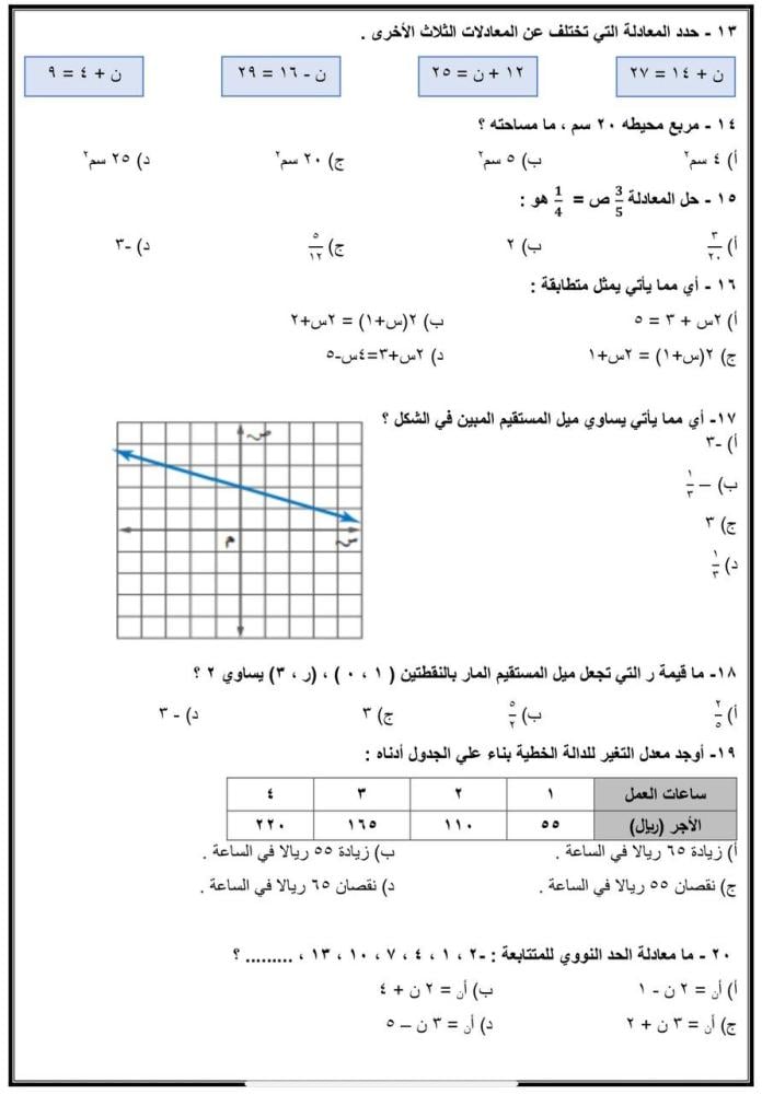 اختبار لمادة الرياضيات للصف ثالث متوسط الفصل الدراسي الأول لعام 1447