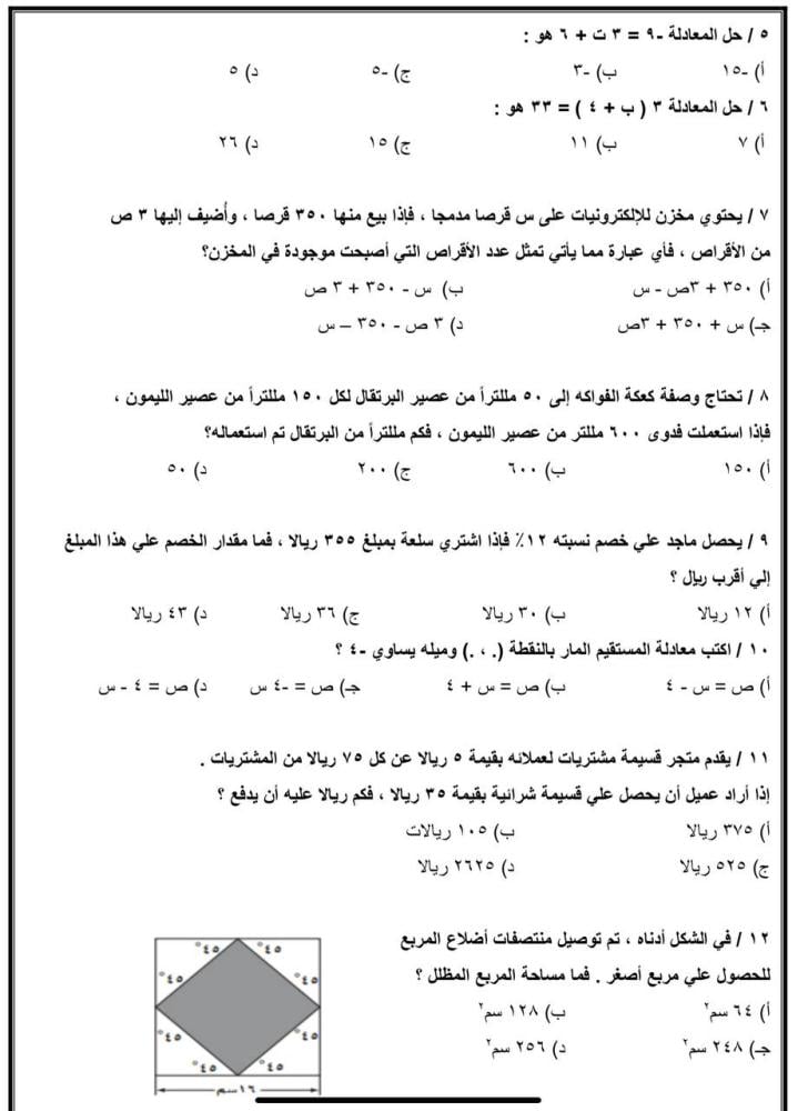 اختبار لمادة الرياضيات للصف ثالث متوسط الفصل الدراسي الأول لعام 1447