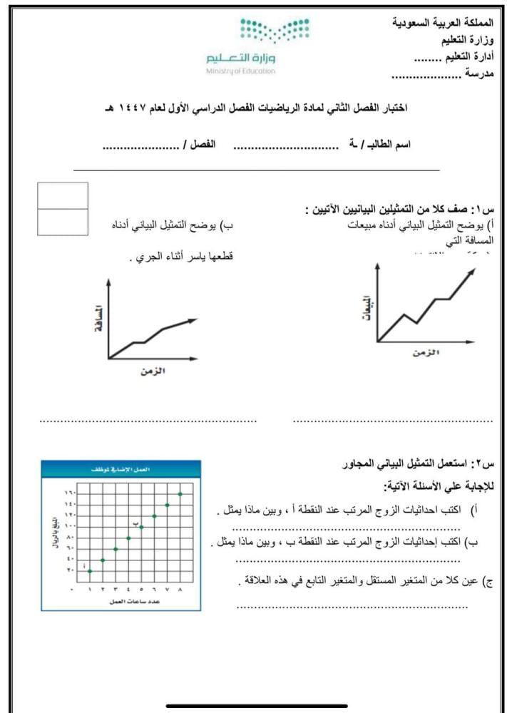 اختبار لمادة الرياضيات للصف ثالث متوسط الفصل الدراسي الأول لعام 1447