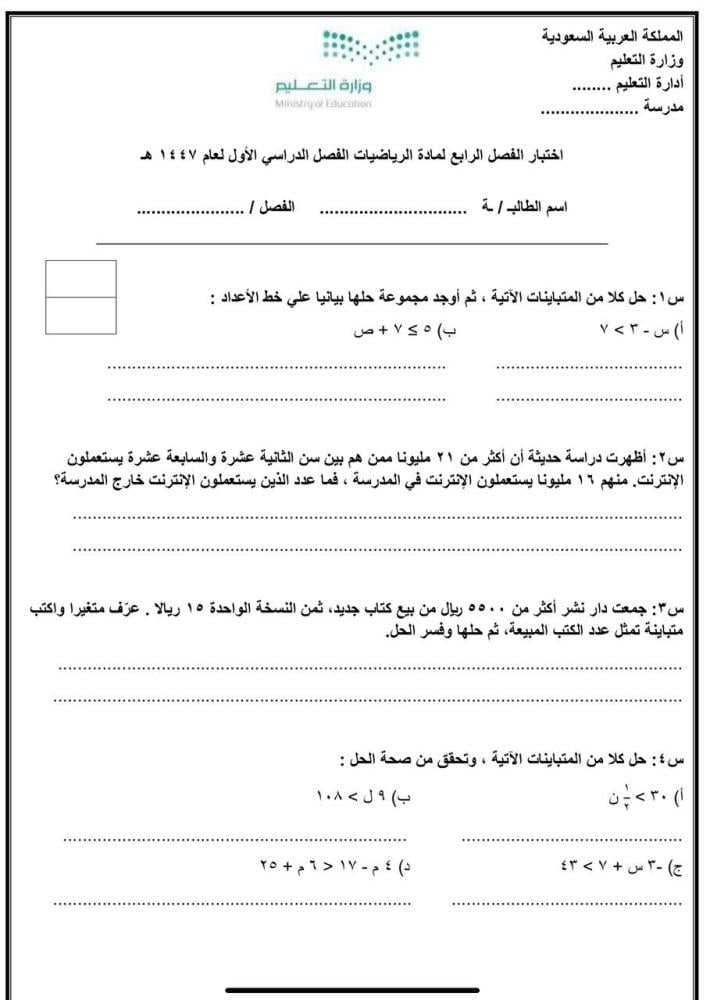 اختبار لمادة الرياضيات للصف ثالث متوسط الفصل الدراسي الأول لعام 1447
