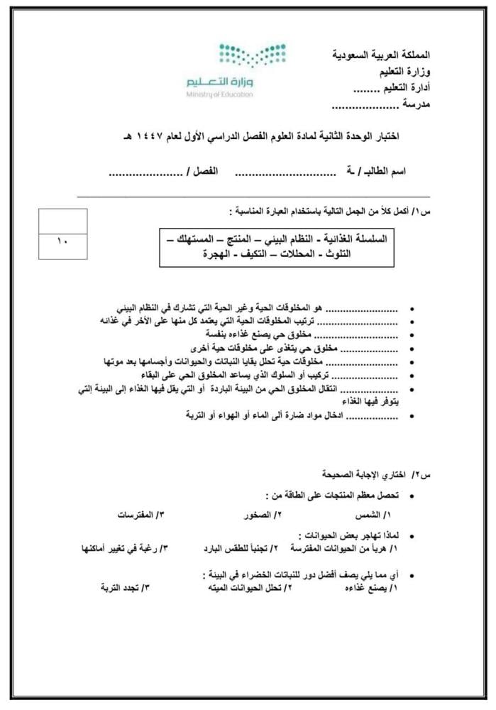 - نموذج اختبار علوم الصف الثالث الابتدائي يعزيز مهارات التفكير والتحليل.