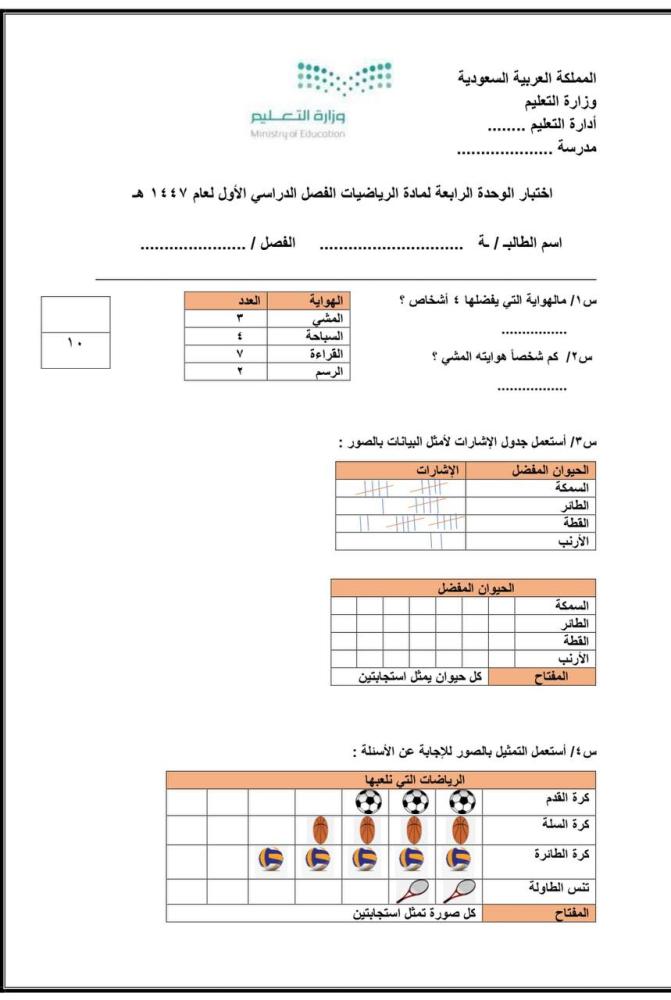 • نموذج امتحان رياضه شامل يغطي جميع مفاهيم الوحدة الرابعة في الرياضيات.